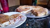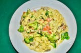 Sauteed chicken, broccoli, roasted peppers, ricotta, mozzarella cheese, garlic and parmigiano.